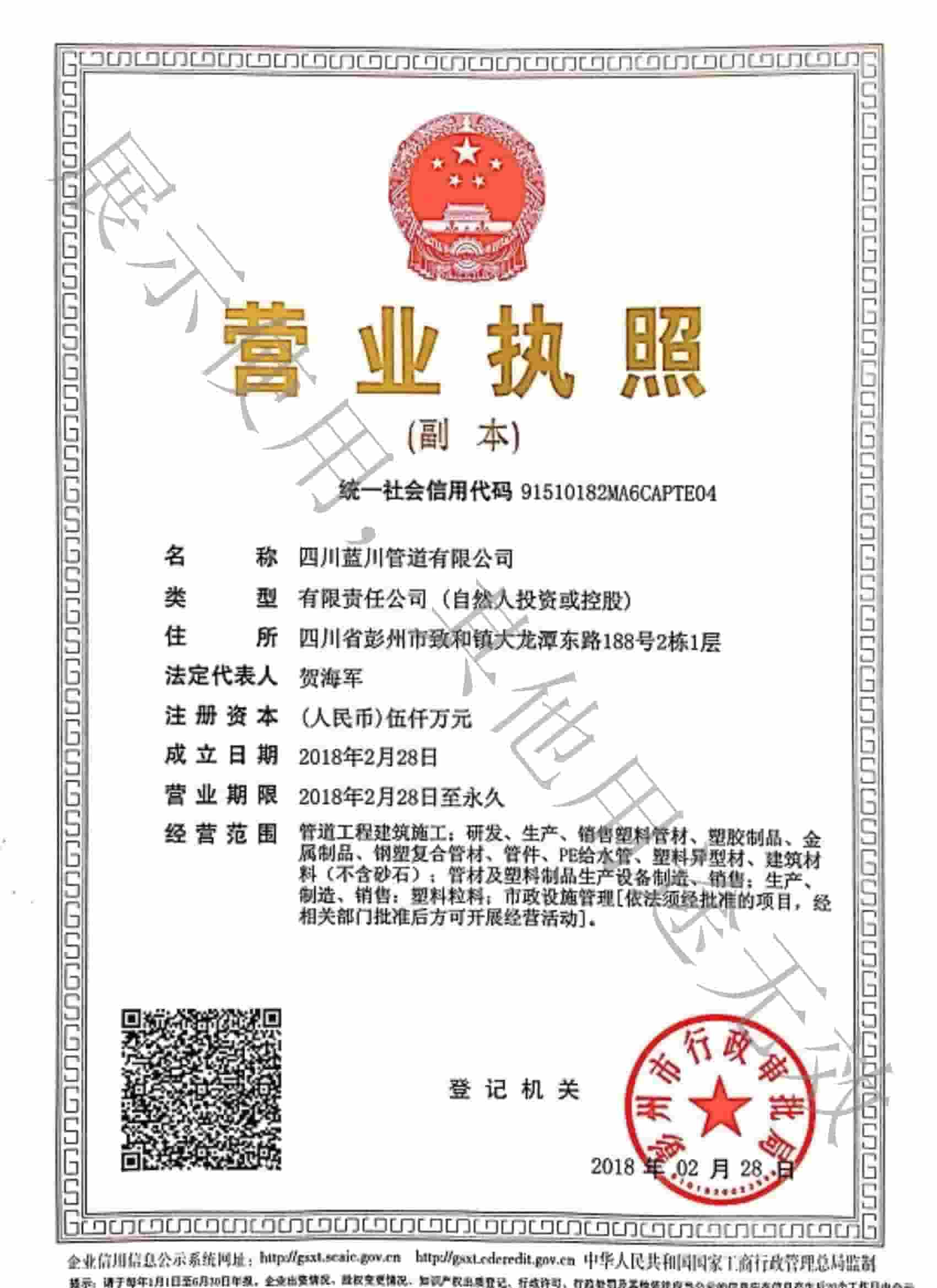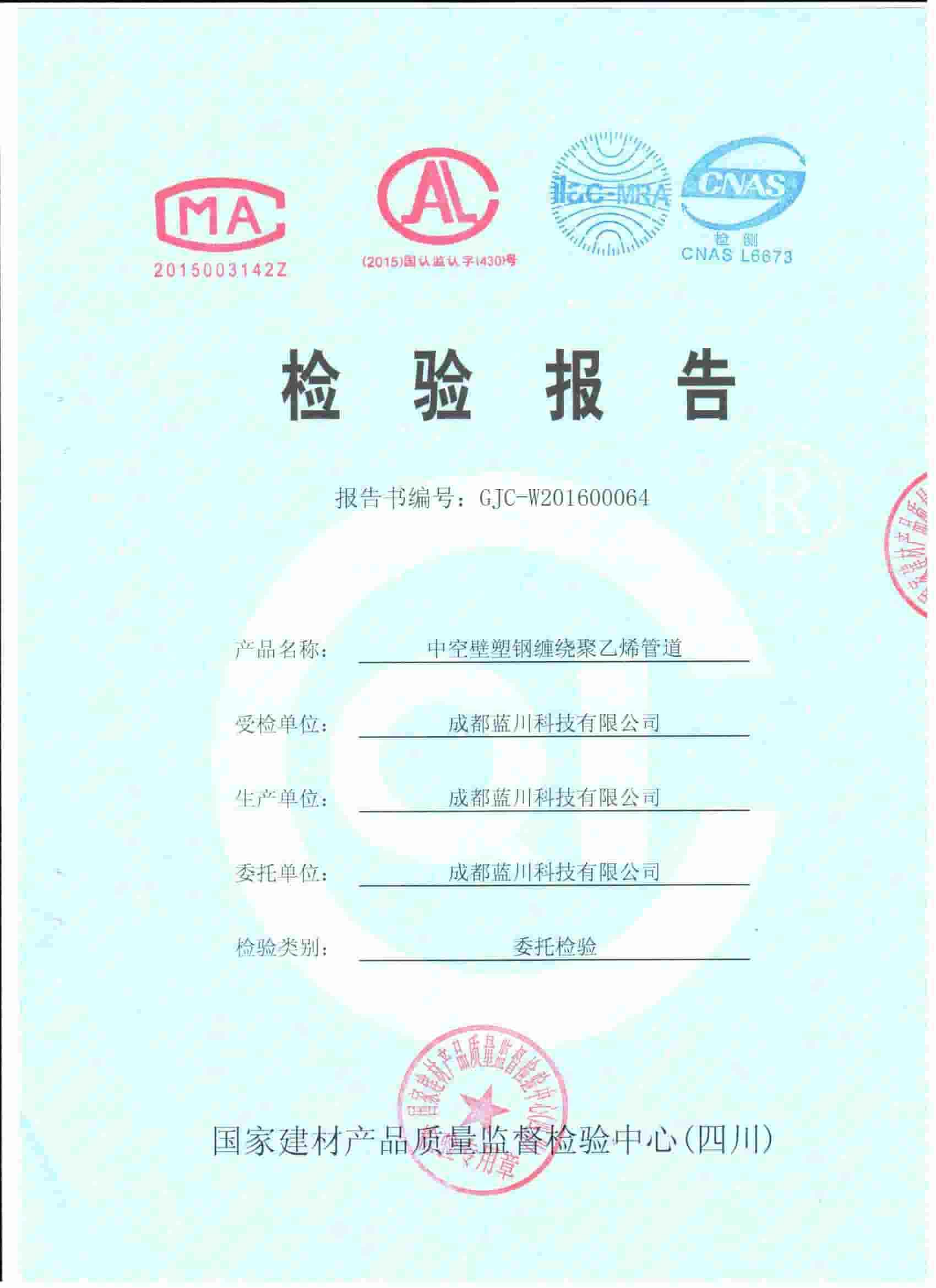 四川藍川管道有限公司(成都藍川科技有限公司)成立于2012年,生產基地坐落于“牡丹之城”四川彭州市工業開發區,營運中心位于成都市高新區益州大道,注冊資本5仟萬,占地面積2萬余平米,年生產能力達1萬噸以上;是一家專業研發、生產、銷售新型市政工程管道的高新技術企業。目前擁有大型市政排水管生產線5條,給水管生產線5條,電力管生產線2條。主要產品有:防脫層鍍鋅鋼骨架纏繞管、雙層壁克拉管、雙色中空壁塑鋼纏繞管、方形雙壁立筋纏繞管、內肋管、雙壁波紋管、給水管、電力管、硅芯管等。 公司是四川省湖南商會“常務副會長單位”和“創新湘商”,中國塑料加工工業協會“塑料管道專業委員會會員單位”,獲得了30余項發明專利和實用新型專利,2020年評為《高新技術企業》,公司通過了《質量管理體系認證證書ISO9001:2015》,《職業健康安全管理體系認證證書OHSAS18001:2018》,《環境管理體系認證證書ISO14001:2015》;公司于2019年主編了《雙色防脫層玻璃纖維增強鍍鋅鋼骨架纏繞管》T/SCSX0906-2019,《雙壁纖維網鋼塑復合管》T/SCSX0916-2019,兩項團體標準,并獲得了四川建設科技發展中心頒發的《四川省建設領域科技成果或應用技術備案證書》;公司“藍川”牌雙孔雙色共擠中空壁塑鋼纏繞聚乙烯管道、GSRC雙色雙層共擠玻纖增強防脫層鍍鋅鋼骨架纏繞管、方形雙壁立筋纏繞管、玻璃纖維增強內肋硅芯層塑料電纜導管系列產品多次被中國企業發展促進委員會、中國優質品牌統計中評定為“綠色環保推薦企業”、“工程建設推薦產品”、“質量.服務誠信AAA企業”、“質量檢驗.國家標準合格產品”、“中國自主創新產品”。